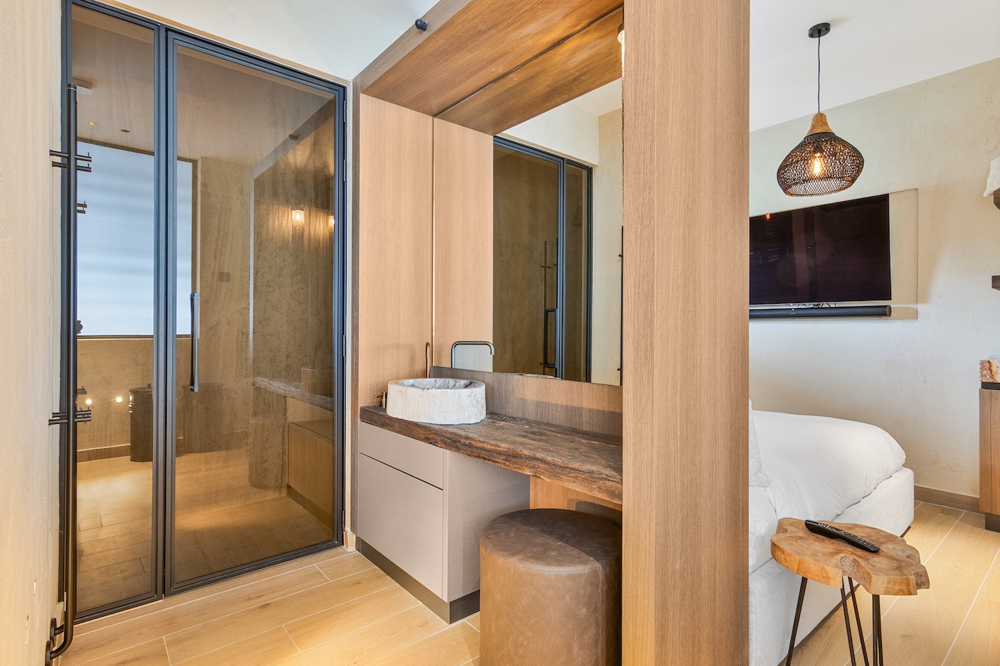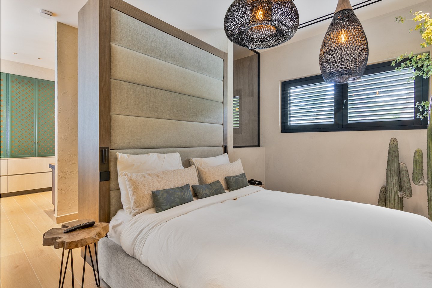 Die Hauptsuite ist ein privates Refugium seltener Genüsse mit einem Jacuzzi an einer herabfallenden tropischen Wasserwand – Ihr persönlicher Spa-Retreat. Belüftete Kleiderschränke im Couture-Stil, lederverkleidete Wände und die Details der weltweit besten Privathotels prägen den Raum.