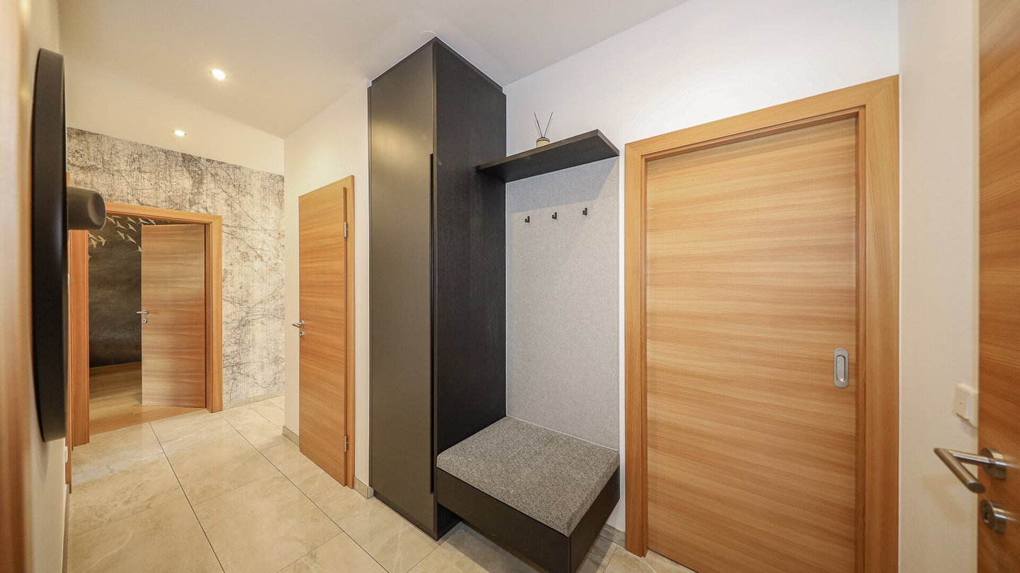 Vom Erdgeschoss, wo 1 Carport- und 1 Garagenstellplatz zum Penthouse gehören, gelangt man über das Treppenhaus in die oberste Etage und betritt sodann die geräumige Garderobe mit Abstellraum und Gäste-Toilette.