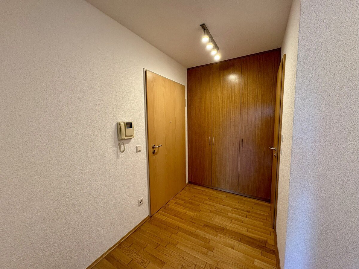 Beim Betreten der Wohnung gelangen Sie in die Diele mit praktischem Einbauschrank. Von hier aus erreichen Sie das Gäste-WC, das Badezimmer mit bodenebener Dusche, das gemütliche Schlafzimmer sowie das großzügige Wohn- und Esszimmer mit Zugang zum überdachten Balkon in Süd-Ost-Ausrichtung.