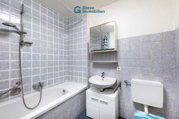 Das gepflegte Badezimmer ist mit Badewanne, Waschbecken, WC und einem großen Spiegelschrank ausgestattet. Helle Fliesen sorgen für ein freundliches und sauberes Gesamtbild.