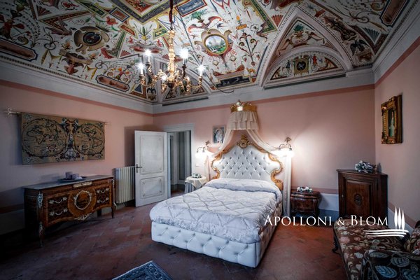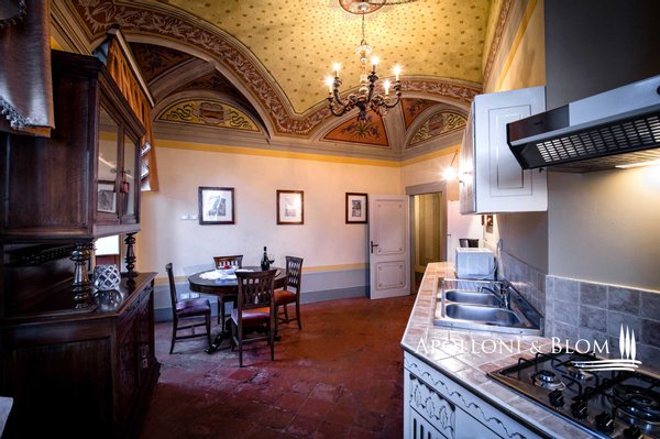 Stock eines Palazzo aus dem 17. Jahrhundert, mit Fresken, Aussicht, Privatkapelle im historischen Zentrum von Cortona, Arezzo, zu verkaufen. In einem der prestigeträchtigsten und perfekt erhaltenen Paläste im Zentrum von Cortona, der ursprünglich im 13. Jahrhundert erbaut, im 17. Jahrhundert vergrößert und mit herrlichen Fresken und Dekorationen von bedeutenden Künstlern der Cortoneser Kunstschule verziert wurde. Die Eingangshalle des Palastes im Erdgeschoss ist prächtig und raffiniert und führt zur Haupttreppe. Im zweiten und obersten Stockwerk befindet sich der einzige Eingang zu diesem an historischen Details reichen Penthouse. Das Wohnzimmer verfügt über zarte Stuckverzierungen an den Wänden und der Decke sowie einen Marmorkamin. Der zentrale Korridor führt zu den Doppelschlafzimmern mit Vorhängen und Stoffen im Barockstil, zur Wohnküche und zu zwei Bädern. Zur Wohnung gehört eine private Kapelle, die noch immer geweiht ist und für private Zeremonien genutzt wird, mit einem Marmoraltar und dem Wappen der Markgrafen mit einem Adler darüber. Alle Zimmer sind mit authentischen Fresken aus dem 17. Jahrhundert und Gewölbedecken dekoriert, bieten einen Blick auf die Stadt oder das Umland und sind klimatisiert. Ob als privater Wohnsitz oder als Einkommensobjekt mit jährlichen Einnahmen aus touristischen Vermietungen, diese Wohnung bietet eine elegante und charmante Atmosphäre. Cortona ist aufgrund seiner Lebensqualität, der von der Natur geprägten Rhythmen und der kulturellen Veranstaltungen, die das ganze Jahr über stattfinden, eines der beliebtesten Ziele für Prominente und VIPs aus aller Welt. Auf einer Höhe von 490 Metern über dem Meeresspiegel gelegen, beherrscht Cortona eine spektakuläre Region an der Grenze zwischen der Toskana und Umbrien, nur wenige Minuten von den Ufern des Trasimenischen Sees, den wichtigsten historischen Stätten, Naturparks und den besten Chianti-Weinkellern entfernt. Cortona bietet alle Annehmlichkeiten, einen Bahnhof und eine gute Anbindung an die Autobahnen.
