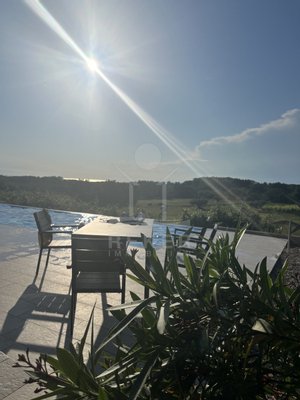Der Außenbereich ist gepflegt und mediterran gestaltet. Die überdachte Terrasse öffnet sich zum 35 m² großen Pool. UV-Sterilisator und Quarzsandfilter reduzieren den Chlorbedarf deutlich und machen das Baden angenehm. Ein gemauerter Grill ergänzt den Garten. Meerblick und Westausrichtung sorgen für entspannte Abende. Ein Platz für lange Sommerstunden.