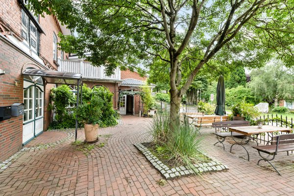 Geschützt im rückwärtigen Teil des Grundstücks gelegen, lädt der Hofgarten mit seinem gewachsenen Bewuchs, Rankpflanzen an alten Ziegelwänden und blühender Bepflanzung zu gemütlichen Stunden im Freien ein.