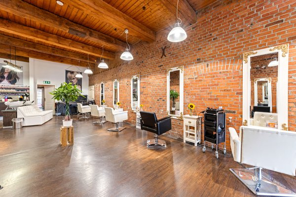 Der ehemalige Stall wurde mit viel Liebe zum Detail zu einem Friseurbetrieb mit 8 Plätzen umgewandelt. Hohe Decken, sichtbare Balkenkonstruktionen, Holzakzente und aufgearbeitetes Mauerwerk machen diesen Raum zu einem inspirierenden Ort – denkbar auch als Atelier, Praxis oder Büroraum.