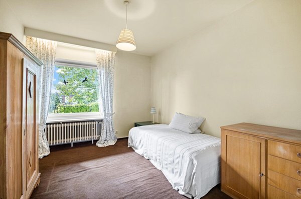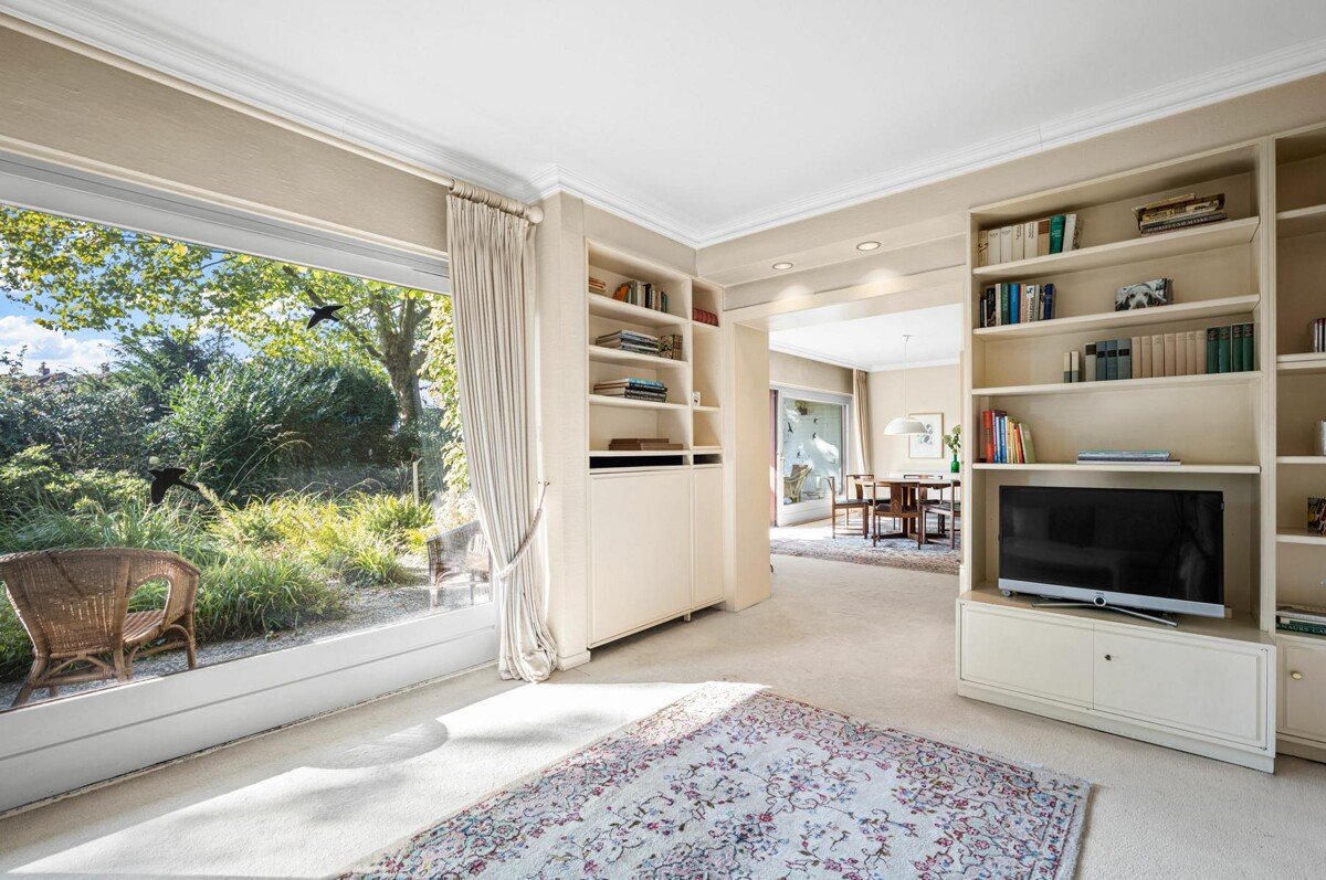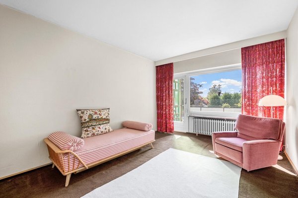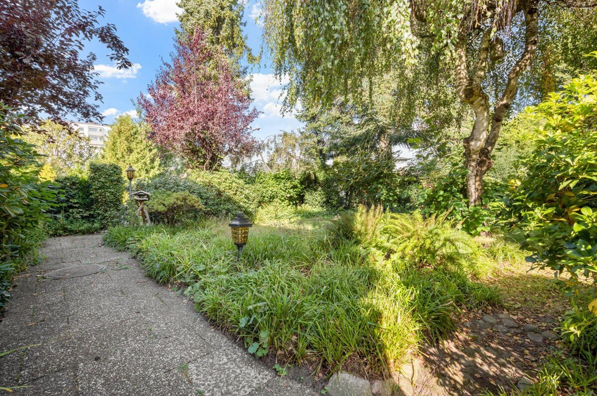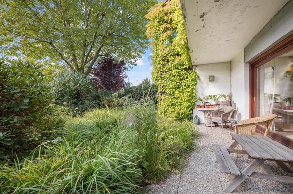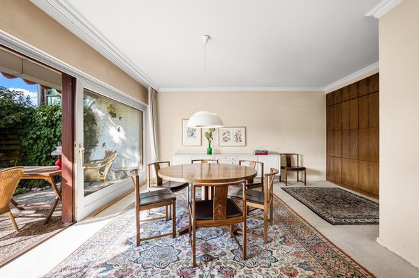 Im Inneren überzeugt die Immobilie durch einen besonders gut proportionierten Grundriss, der auch in der zusammengelegten Form ein angenehmes Raumgefühl vermittelt. Das Wohn- und Esszimmer mit seinen jeweils ca. 5 Meter breiten Fensterfronten und Hebeschiebefenstern öffnet den Blick weit in den Garten und schafft eine großzügige Wohnatmosphäre.