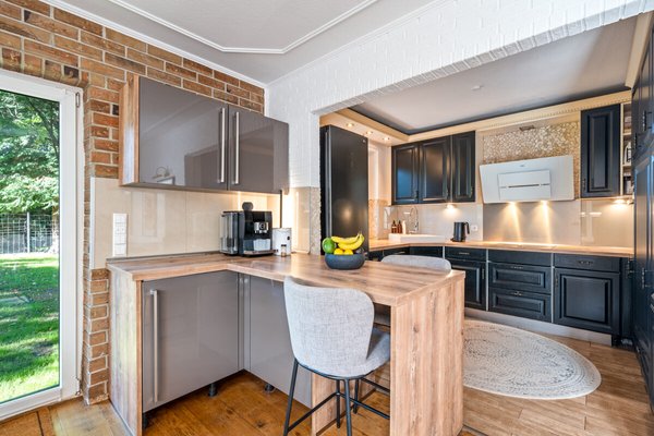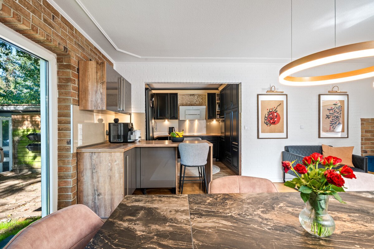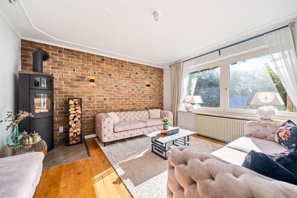 Durch die Doppeltür kommen Sie in den großzügigen Wohn-/Essbereich, wo Sie sich sofort wohl fühlen. Die Ziegelwand, der Kaminofen und der Parkettfußboden mit seinen großen Planken vermitteln ein sehr gemütliches Wohngefühl. Von hier aus gelangen Sie durch einen Wanddurchbruch in den großzügigen Essbereich mit offener Küche und einem Esstresen. Die zum Essbereich hin offene Küche schließt sich direkt an und ist mit ihren schwarzen Fronten ein optisches Highlight. Die Marken-Einbaugeräte in der Farbkombi Schwarz/Edelstahl matt gebürstet sind sehr ansprechend und unterstreichen das edle Gesamtdesign dieses Wohnbereichs. Vom Essbereich führen zwei große Terrassentüren auf die überdachte Süd-West Terrasse mit Blick in den gepflegten Garten, wo Sie sich entspannen und Ihre Kinder spielen können. Weiter finden Sie im Erdgeschoss ein Zimmer, das derzeit als Büro/Gästezimmer genutzt wird.