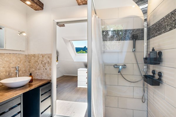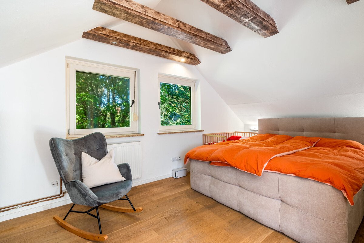 Über die dunkle Holztreppe gelangen Sie ins Obergeschoss. Hier erwarten Sie ein weiteres Kinderzimmer sowie der großzügige Eltern-/Schlafbereich mit offener Ankleide. Die sichtbaren Holzbalken an der Decke und ein en suite Vollbad mit satinierter Glastür schaffen ein warmes und wohnliches Ambiente.