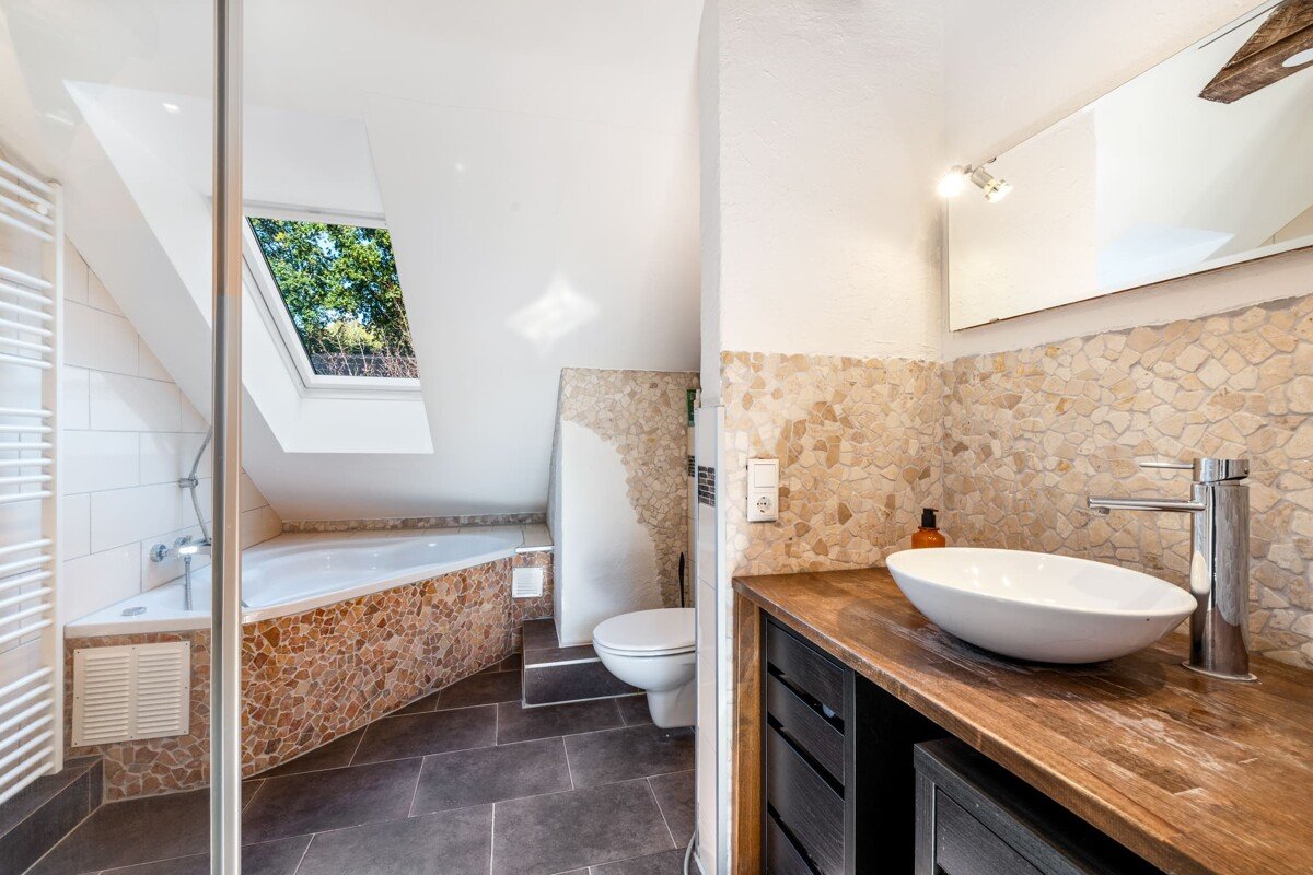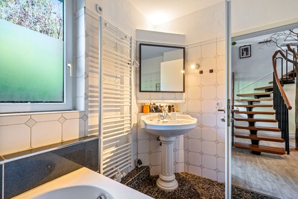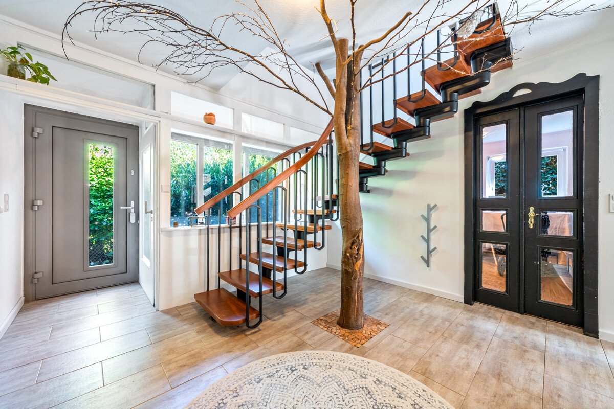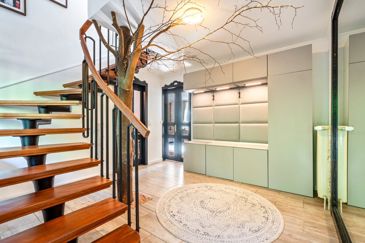 Wenn Sie das Haus betreten, werden Sie im großzügigen Flur von einem markanten Baumelement begrüßt, das aus dem Boden zu wachsen scheint. Neben dem (neuen) Hauseingang ist eine Glasfront, die viel Licht in den Eingangsbereich herein lässt. Vom Flur aus gelangen Sie in eins der beiden modernisierten Vollbäder des Hauses. Die sehr schöne dunkle Holztreppe mit schwarzem Metallgeländer führt Sie ins OG. Der Kellerabgang ist mit einer Tür zum Flur geschlossen und dadurch separiert.