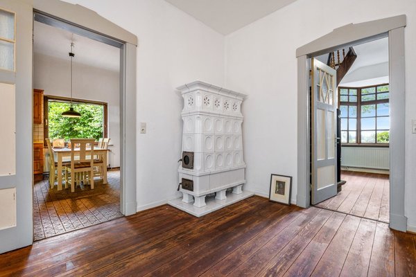 Die Hauptvilla aus dem Jahr 1870 verfügt über eine Wohnfläche von ca. 141 m², verteilt auf vier großzügige Zimmer. Sie wurde über die Jahre hinweg liebevoll gepflegt und instand gehalten, wobei stets darauf geachtet wurde, den originalen Charakter des Hauses zu bewahren. Die lichtdurchfluteten Räume, die beeindruckend hohen Decken sowie zahlreiche historische Details – viele davon über ein Jahrhundert alt – verleihen dem Haus einen besonderen Charme und eine gemütliche Atmosphäre.
