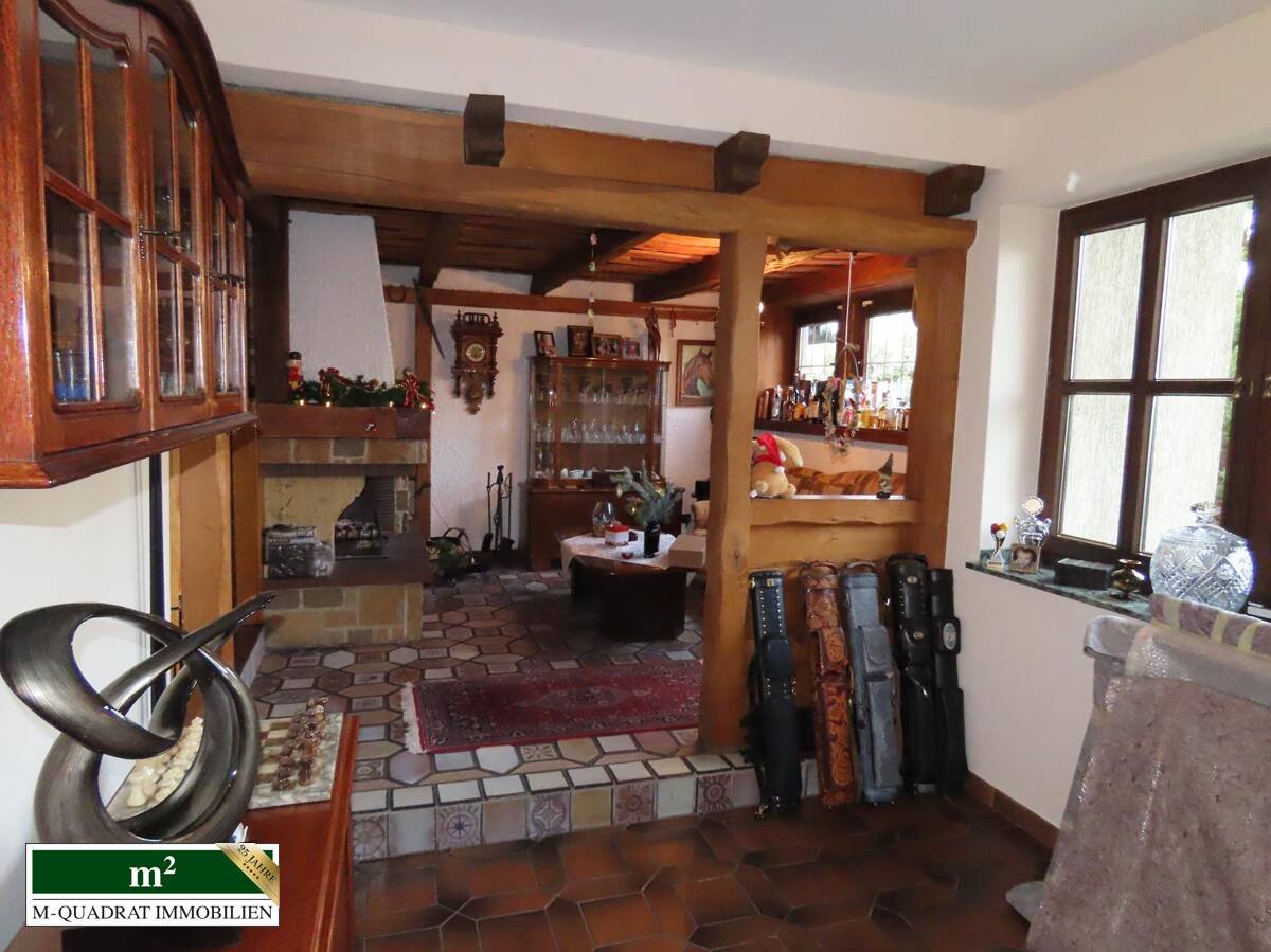 An den Eingangs- schließt sich der großzügig gestaltete Wohnbereich mit Küche, im halbrunden Erker gelegen Essensecke, Kamin- und Wohnzimmer an. Durch eine Öffnung in das I.OG und den dadurch entstehenden Luftraum ist dieses sehr hell und luftig. Im gesamten EG finden sich große Bodenfliesen aus rustikaler Keramik, handgeformte flämische Keramikfliesen und rustikale sandgestrahlte Eichenbalken, z.T. mit schmiedeeisernen Elementen verziert.
