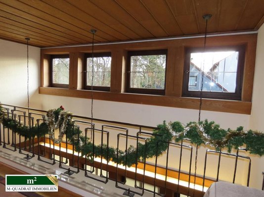 Über eine massive halbgerundete Stahlbetontreppe mit Holzbelag gelangt man sowohl in die Obergeschosse, als auch den z.T. wohnlich anmaßenden Keller.