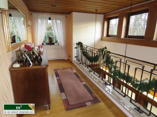 Das freistehende EFH mit EL-Wohnung besticht durch seine architektonische Bauweise. Es wurde im Jahre 1980 in solider Bauweise errichtet. Durch den anmutigen Treppenturm sind die beiden Hauseingänge voneinander getrennt. Der Eingangsbereich ist mit Treppenstufen in Travertin angelegt. Die Türanlage besteht aus massivem Eichenholz mit Butzenverglasung. Der links gelegene Eingangsbereich des Hauptteils ist durch Einbaumöbel und Garderobeneinbauten in rustikalem Charakter geprägt. Zur rechten Seite befindet sich die Gäste-Toilette.