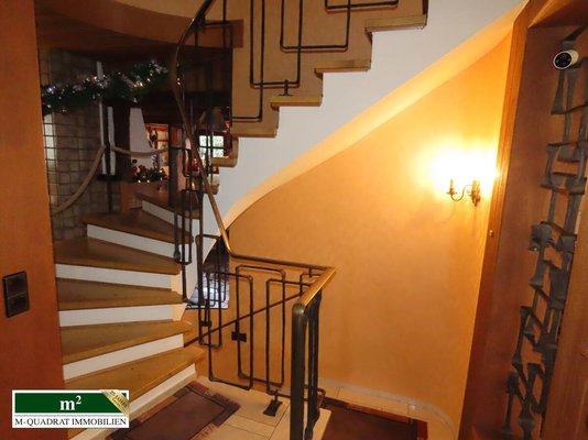 Über eine massive halbgerundete Stahlbetontreppe mit Holzbelag gelangt man sowohl in die Obergeschosse, als auch den z.T. wohnlich anmaßenden Keller.
