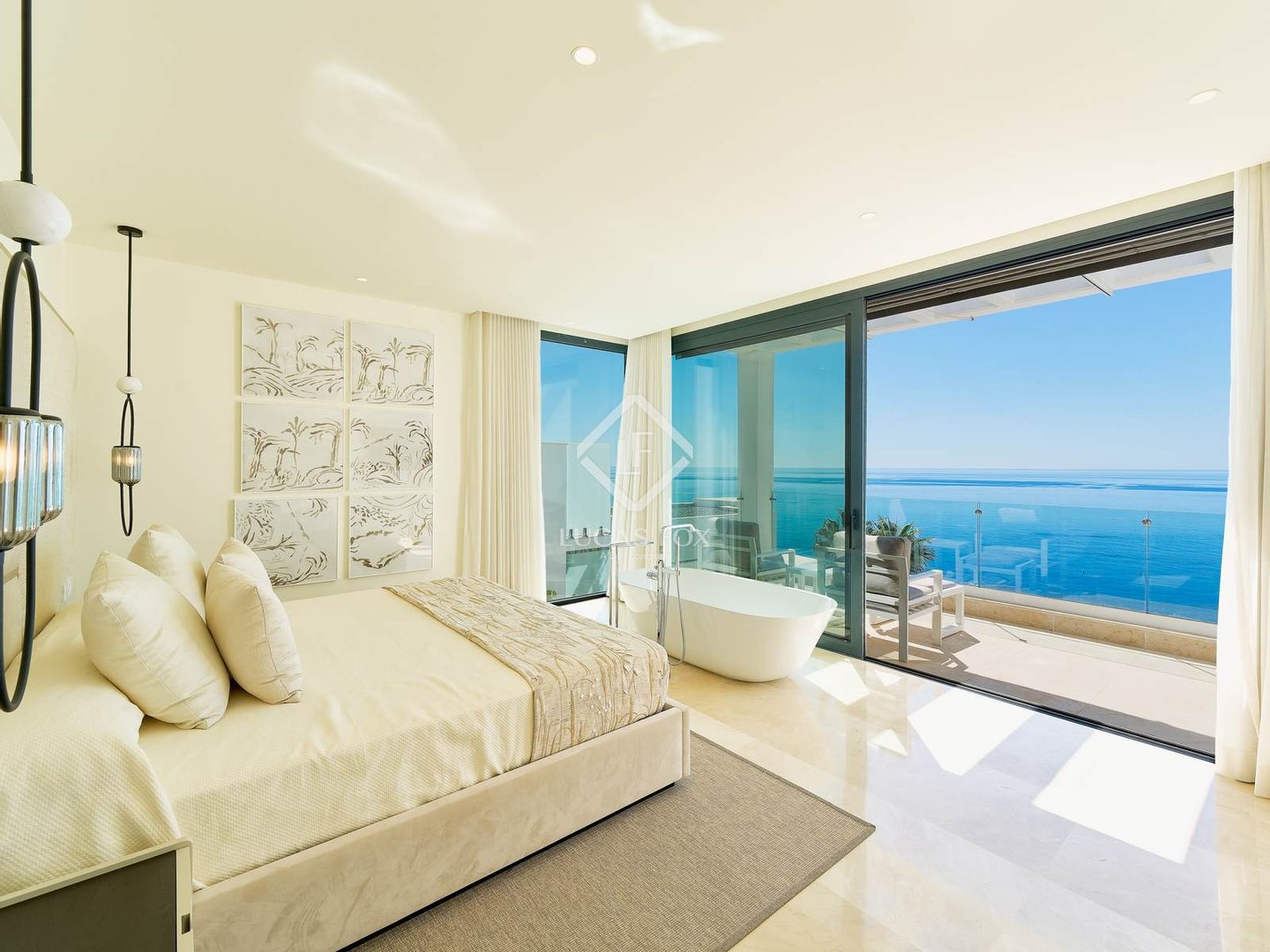 Im ersten Stock befindet sich der Nachtbereich mit drei Schlafzimmern mit Ankleidezimmern und eigenem Bad, darunter das Hauptschlafzimmer mit Designer-Badewanne und privater Terrasse mit Blick auf das Mittelmeer.