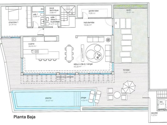 Im Außenbereich befindet sich die Hauptterrasse mit einem großen Pool, der so konzipiert ist, dass Sie den mediterranen Lebensstil in vollen Zügen genießen können. Der elegant gestaltete Infinity-Pool verfügt über einen kleinen Bereich im Strandstil. Auf der Terrasse befindet sich auch ein Grillplatz, der sich perfekt eignet, um Momente im Freien mit Freunden und Familie zu teilen.