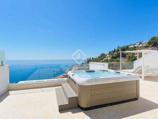 Die oberste Etage zeichnet sich durch eine spektakuläre Sonnenterrasse mit Whirlpool und unglaublicher Aussicht aus.