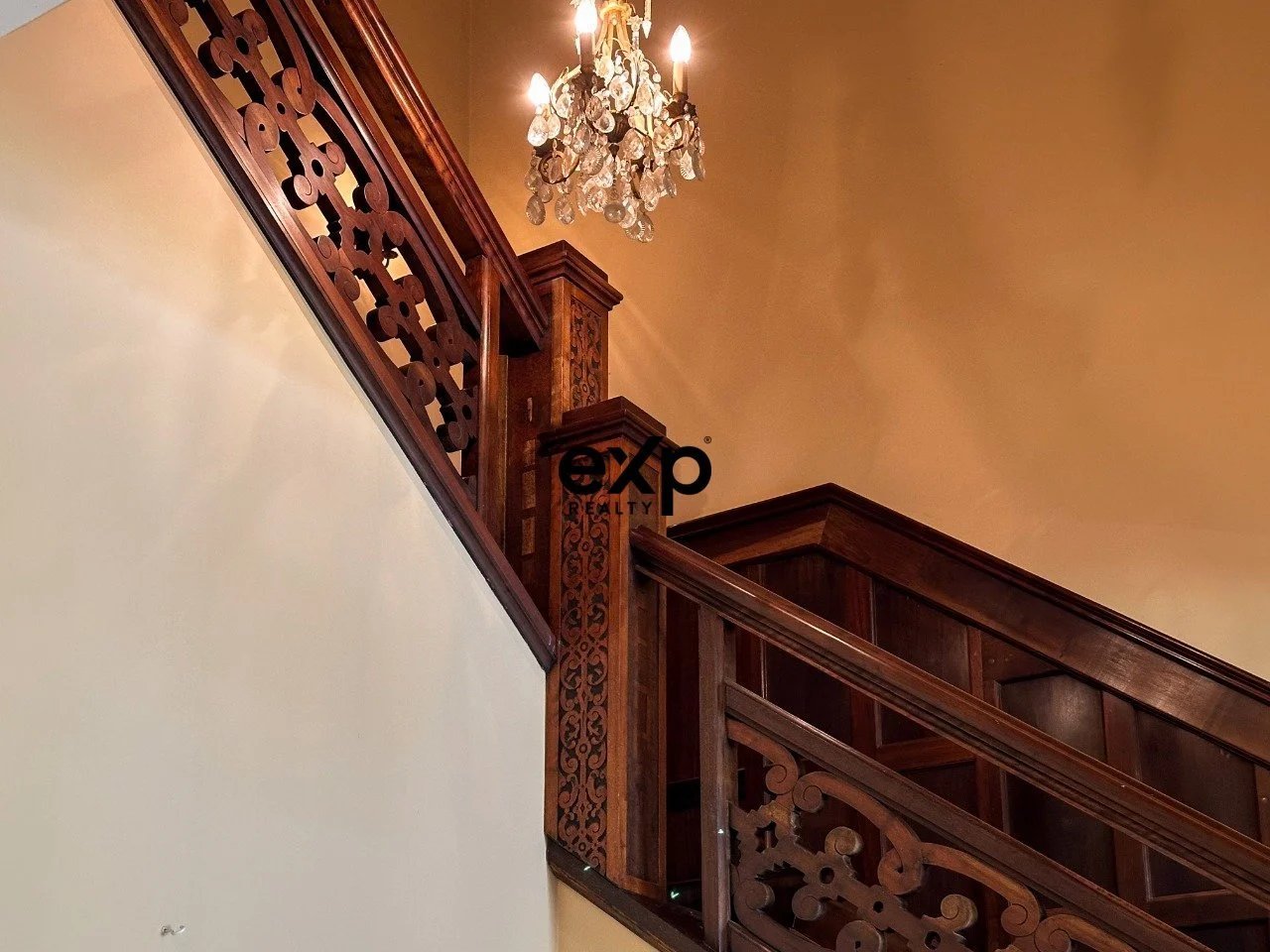 Künstlerische Verzierungen, wie handgeschnitztes Massivholz, farbige Buntglasfenster und andere Elemente des Autors