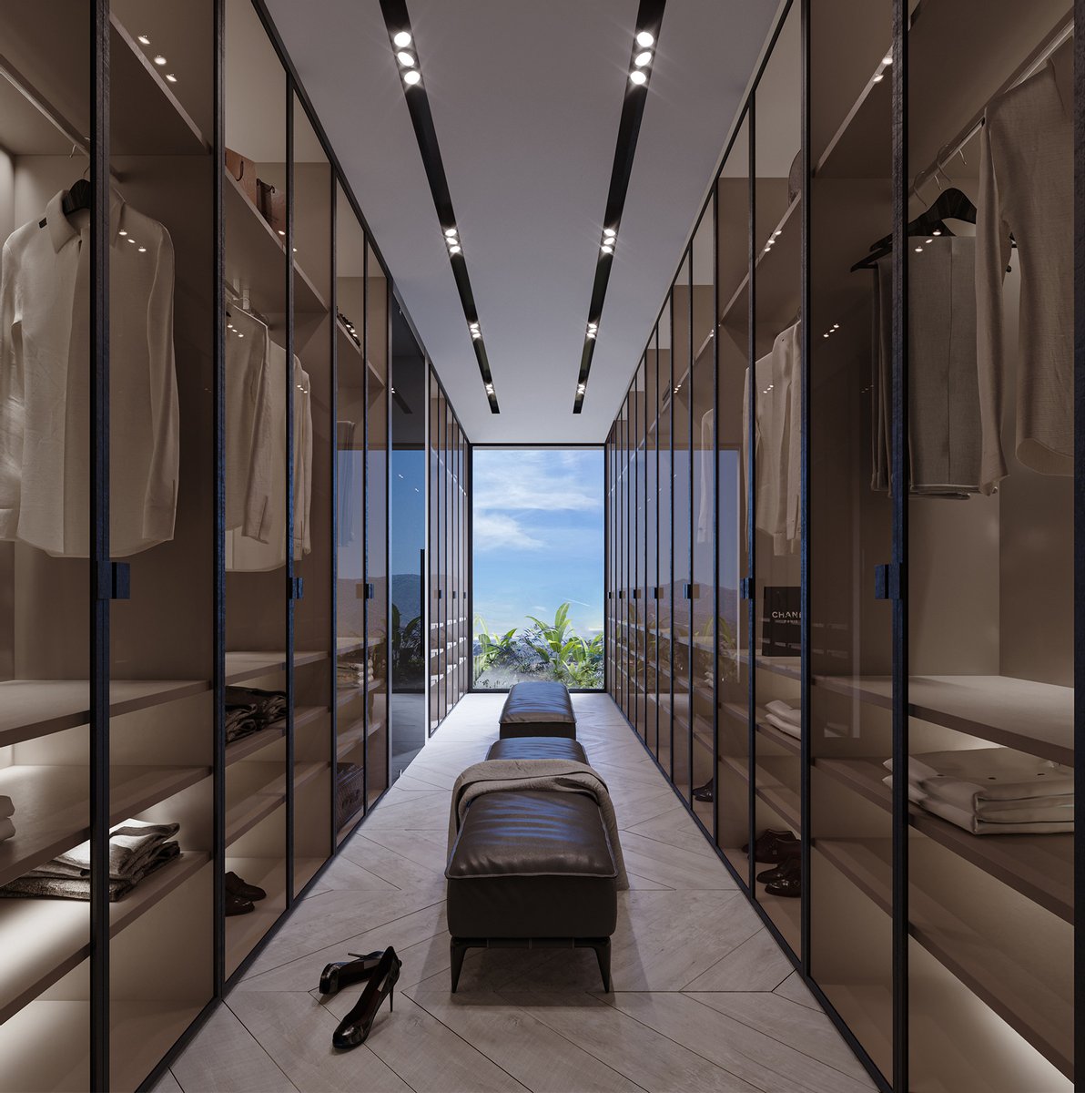 Im Inneren werden die Räume durch bodentiefe Fenster mit natürlichem Licht durchflutet. Die Villa verfügt außerdem über ein Hallenbad, ein privates Fitnessstudio und ein separates Büro, das Luxus und Funktionalität vereint. Die Hauptsuite öffnet sich direkt auf die Terrasse und verfügt über einen Ankleidebereich sowie ein luxuriöses Badezimmer.