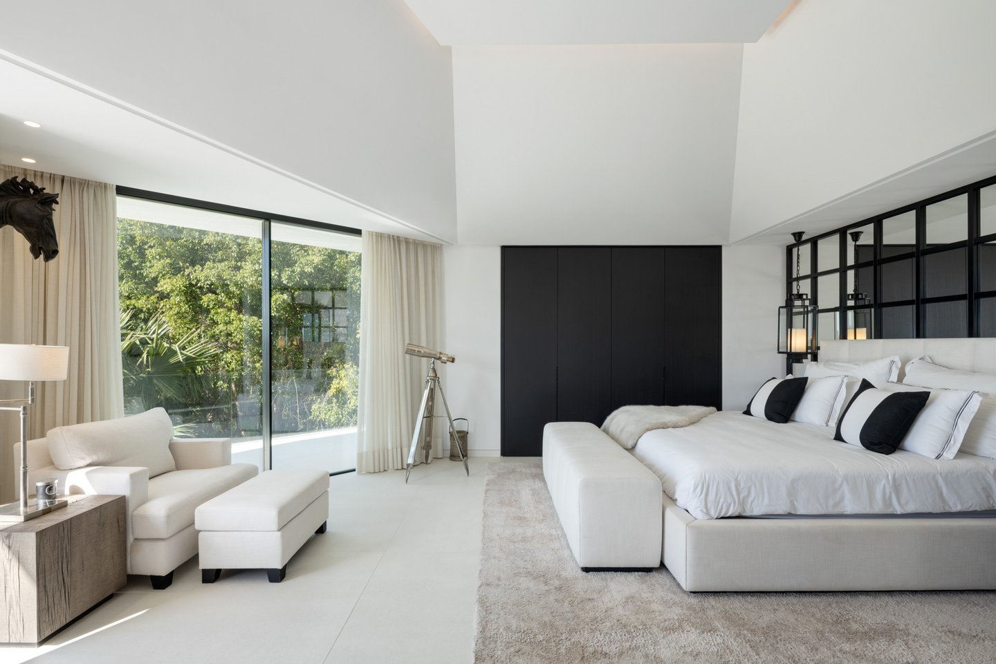 Im Außenbereich führt eine gestaltete Terrasse zu einem Infinity-Pool, der scheinbar in den üppigen Garten übergeht – komplett mit automatischer Bewässerung. Diese Oase eignet sich perfekt für sonnige Nachmittage oder elegante Abendveranstaltungen.