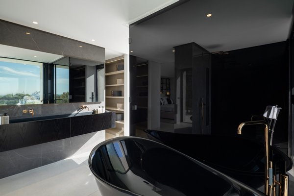 Das Anwesen verfügt über fünf geräumige Schlafzimmer und acht Badezimmer, davon sechs en-suite, alle mit edlen Materialien und großen Fenstern, die einen atemberaubenden Blick auf das Mittelmeer bieten. Der offene Grundriss betont das natürliche Licht und schafft nahtlose Übergänge zwischen Wohn-, Ess- und Entspannungsbereichen. Zwei zusätzliche Gäste-WCs sorgen für zusätzlichen Komfort.