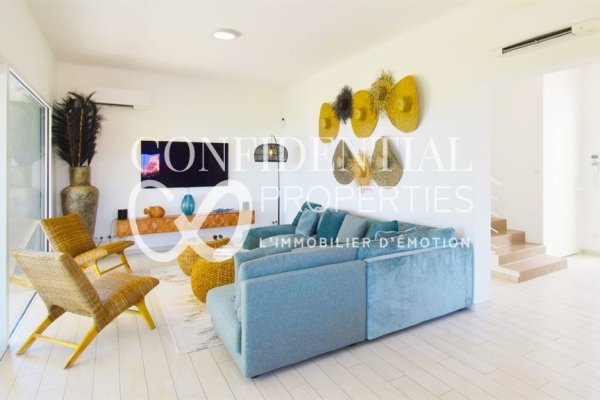 The light-filled reception areas comprise a living room and dining room opening onto a vast south-facing terrace, enhanced by a bioclimatic pergola, creating a seamless flow between indoors and outdoors.
