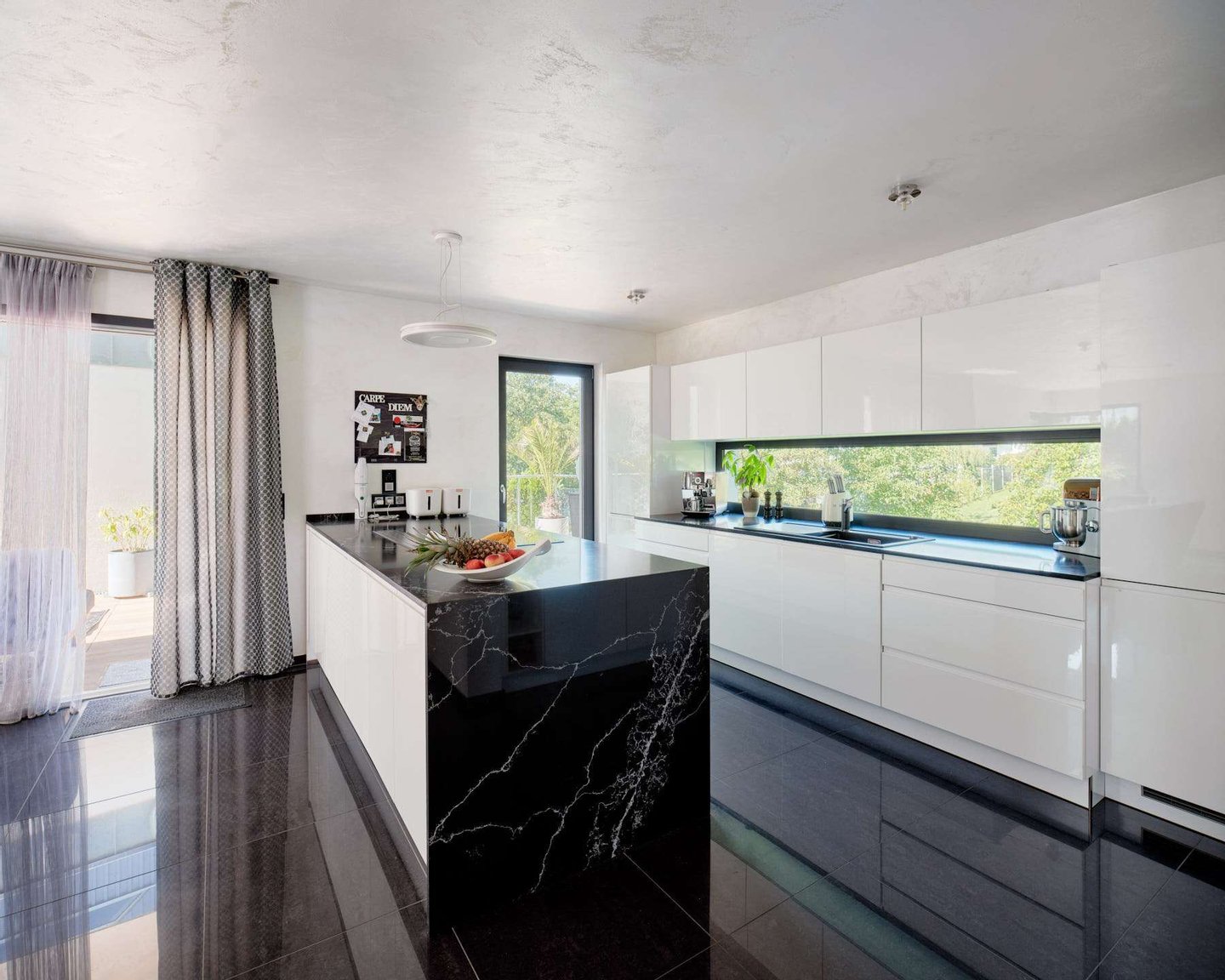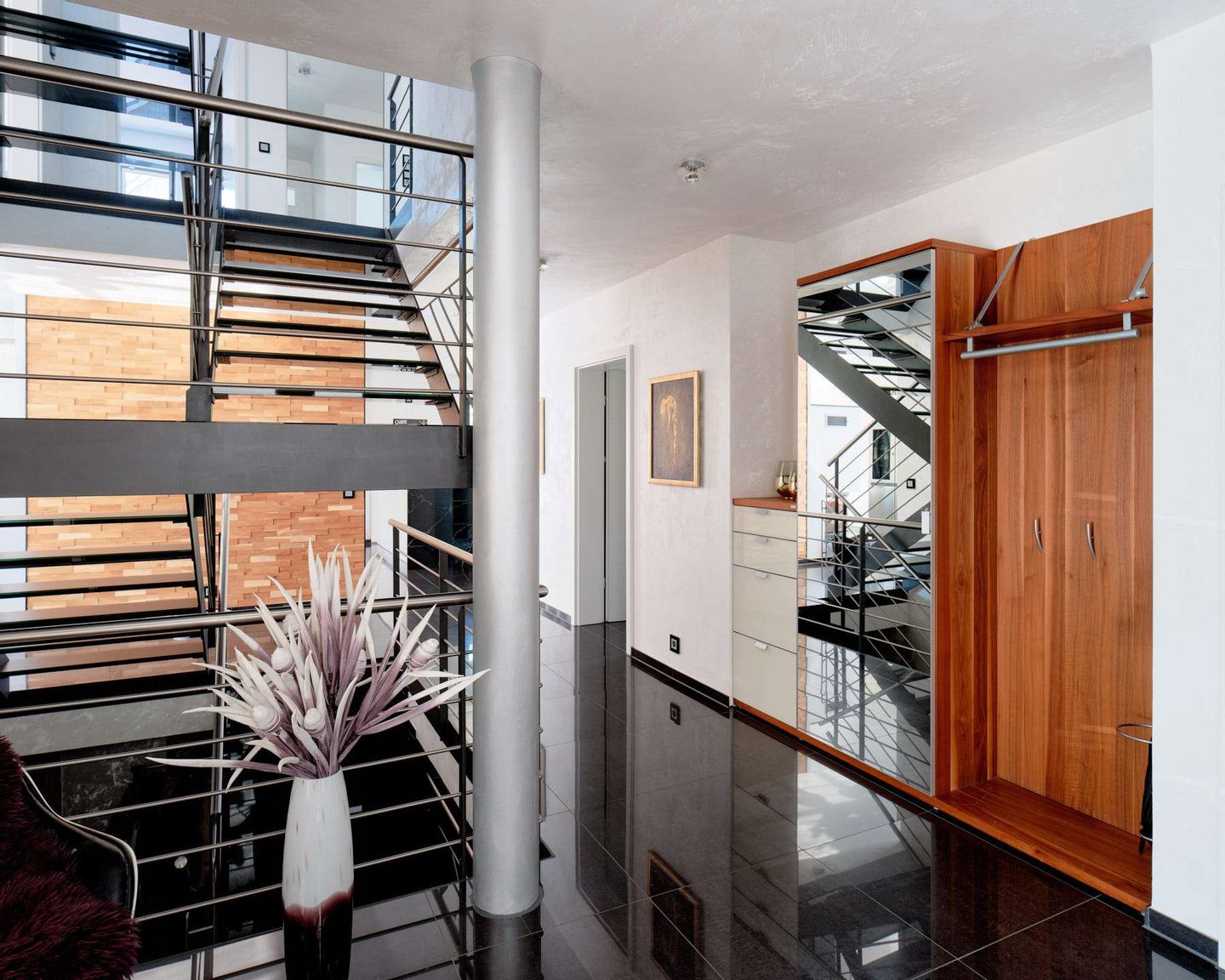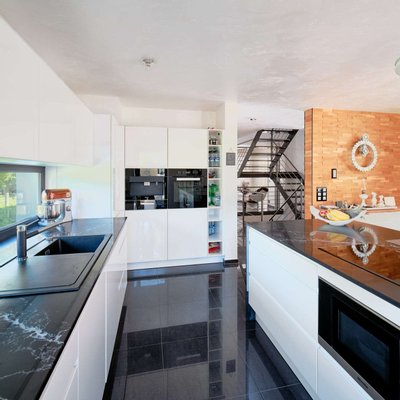 Die hochwertige Ausstattung lässt keine Wünsche offen: edler Granitboden, ein stilvoller Kamin im Wohnbereich sowie eine exklusive Einbauküche unterstreichen den außergewöhnlichen Charakter des Hauses. Drei elegant gestaltete Bäder ein praktischer Abstellraum sowie ein geräumiges UG mit einem einer Boutique ähnelnden Ankleideraum sorgen für Funktionalität und höchsten Wohnkomfort.