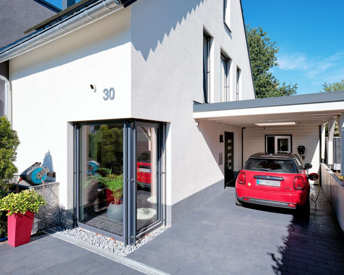 Ein Carport mit Wallbox sowie ein weiterer Außenstellplatz stehen für Ihre Fahrzeuge zur Verfügung.