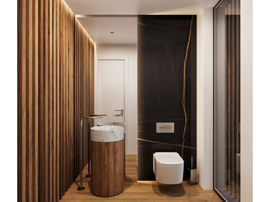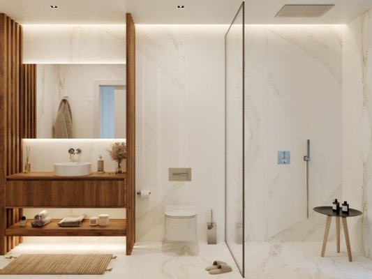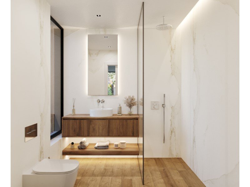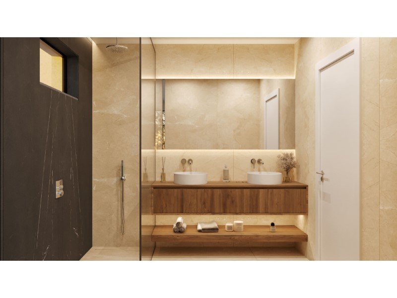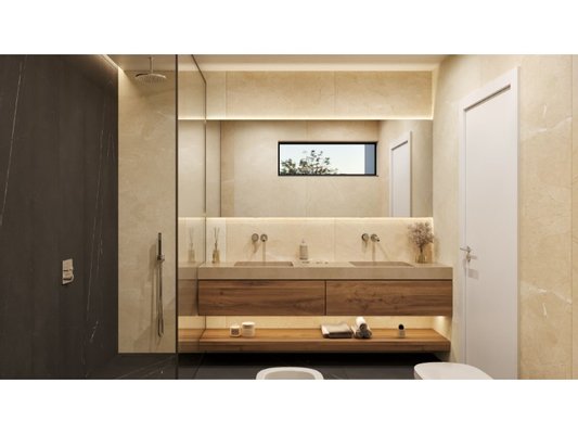 Die Küchen sind mit Silestone-Arbeitsplatten, Walnussholzschränken mit integrierter Beleuchtung, weiß lackierten Einheiten und SMEG/Siemens-Geräten ausgestattet. Die Badezimmer verfügen über rutschfeste Porzellanoberflächen, hängende Waschbecken aus Naturnussholz und aufgehängte Sanitärwaren von Villeroy & Boch.