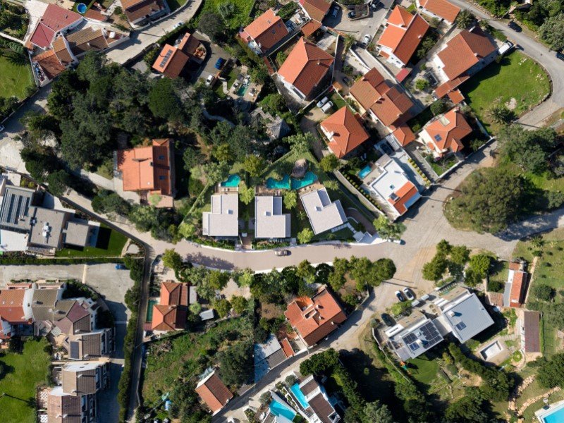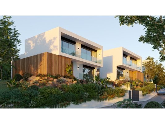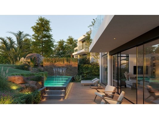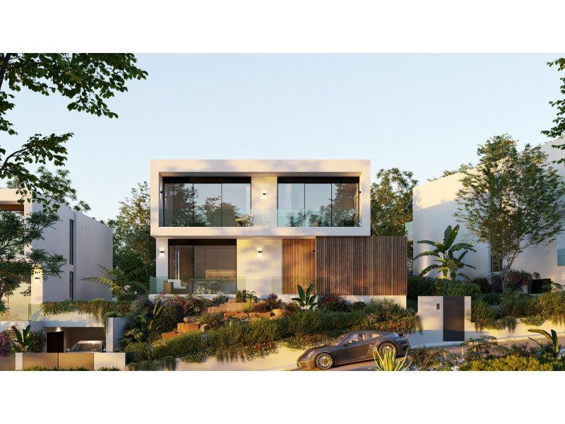 Die angelegten Gärten umfassen üppige Vegetation mit einheimischen Arten, behandelte Holzstufen und ein automatisiertes Bewässerungssystem, das Sprinkler und Tropfbewässerung kombiniert. Das Schwimmbecken verfügt über ein natürliches Design mit Überlaufkaskade und Wasserrückgewinnungssystem, das mit italienischem Porzellanmosaik und Naturstein versehen ist und mit Schiefer verkleideten umgebenden Wänden verkleidet ist. Außentreppen und Terrassen sind mit Mikrozement versehen, ergänzt durch LED-Außenbeleuchtung. Die Villen sind außerdem mit einer Hausautomationsinfrastruktur, einem strukturierten Datennetzwerk, CCTV-Vorinstallation und einem Gasdetektionssystem ausgestattet.