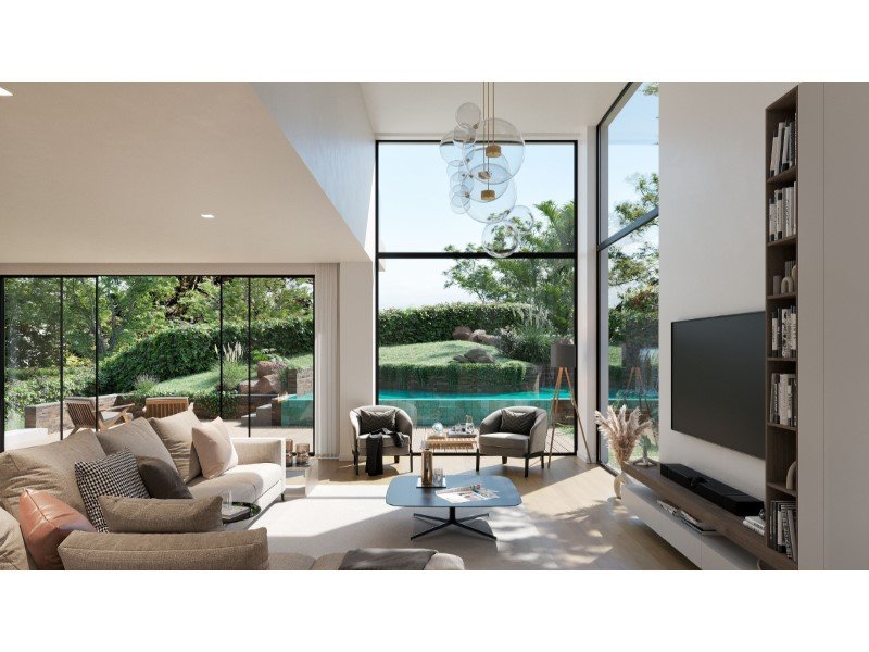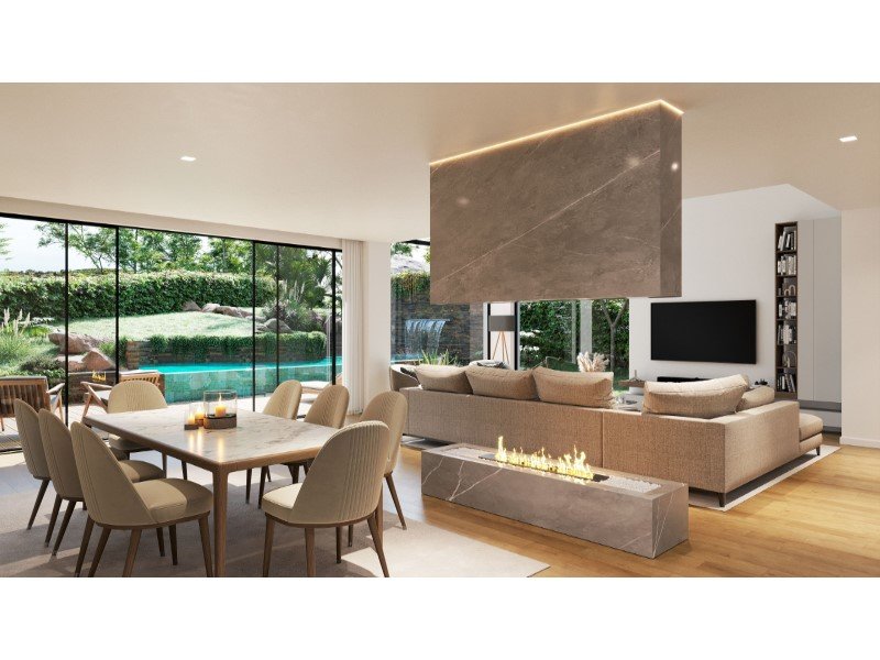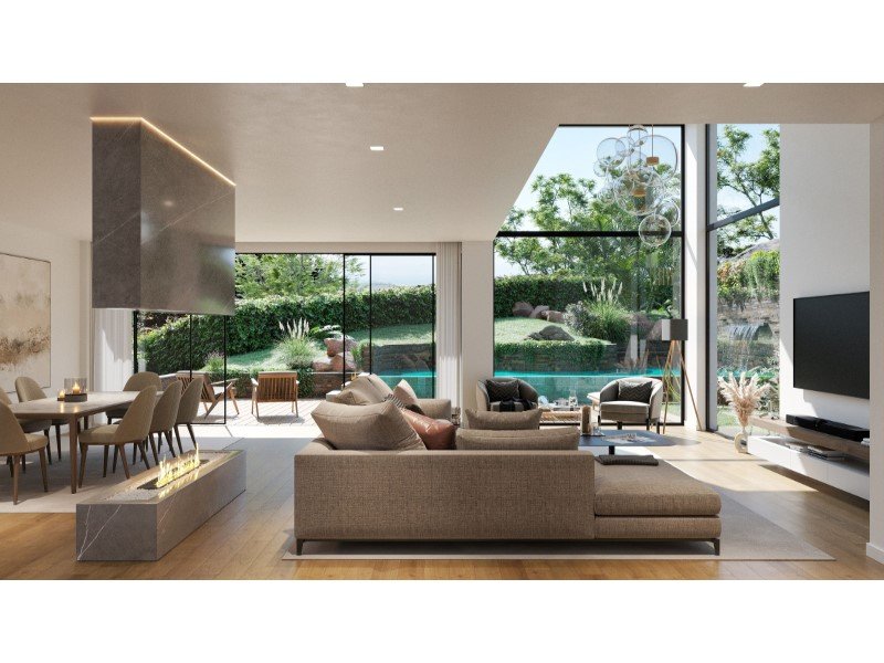 Im Erdgeschoss umfasst der Grundriss eine Eingangshalle, ein Gästebad, ein Schlafzimmer mit eigenem Bad, Küche und einen großzügig gestalteten Wohnbereich mit klar abgegrenzten Lounge- und Essbereichen sowie einen eigenen Bürobereich. Die sozialen Bereiche bieten direkten Zugang zur Außenfassade, mit Verbindung zur gedeckten Terrasse, zum Schwimmbad und zum privaten Garten, was einen nahtlosen Fluss zwischen drinnen und draußen gewährleistet.