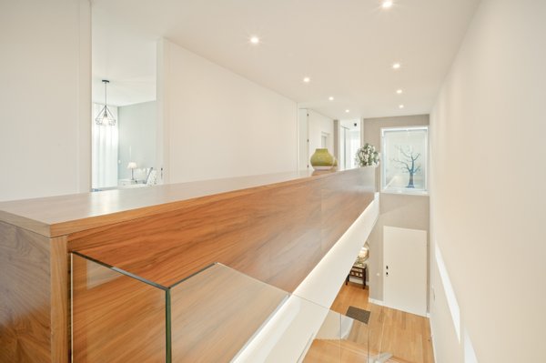 Staircase with metal frame, solid oak treads, and glass railings with concealed fixings