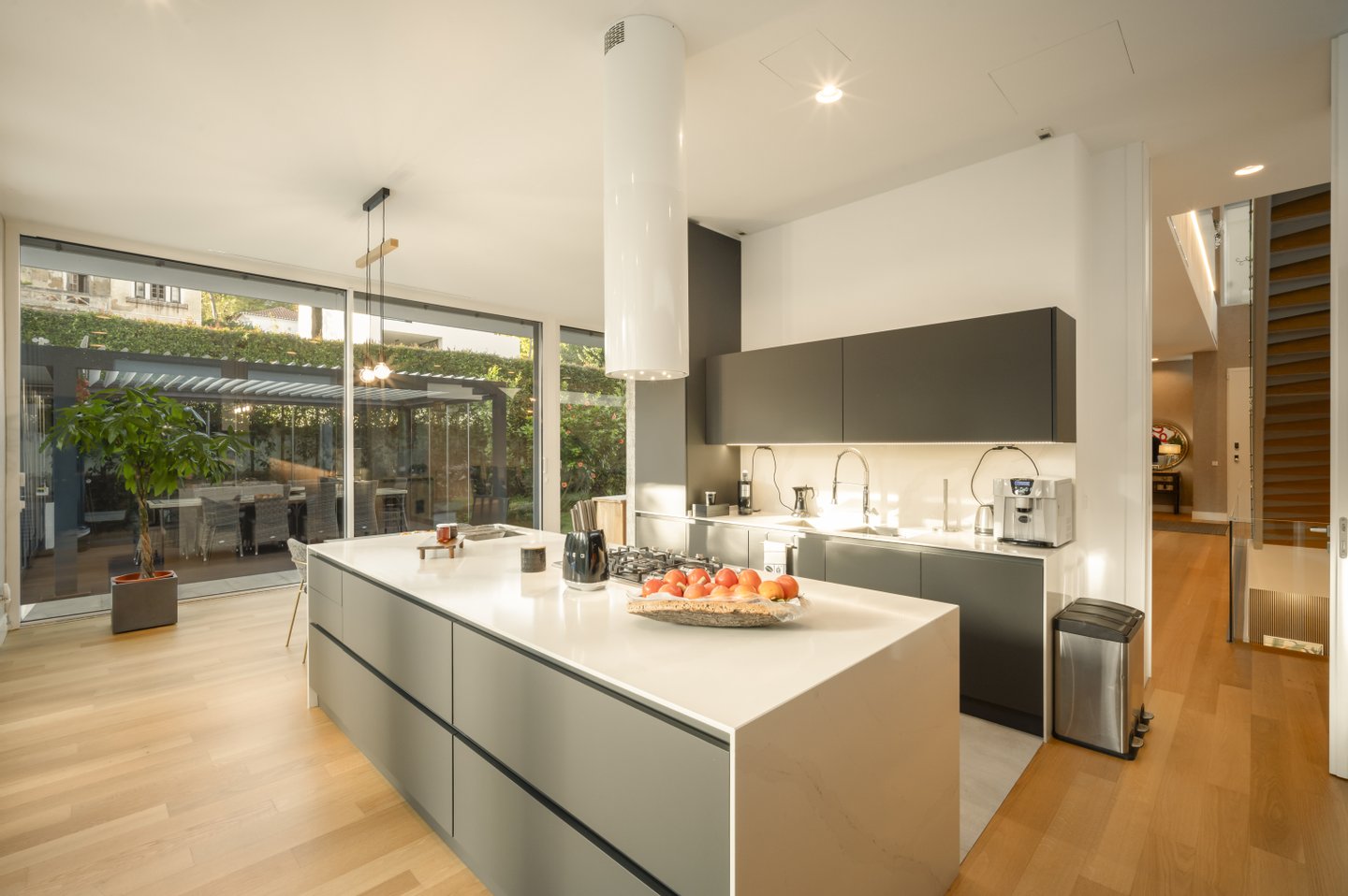 A modern, fully equipped kitchen with Miele appliances, measuring 34.70 m², designed for both functionality and style. Guest WC.