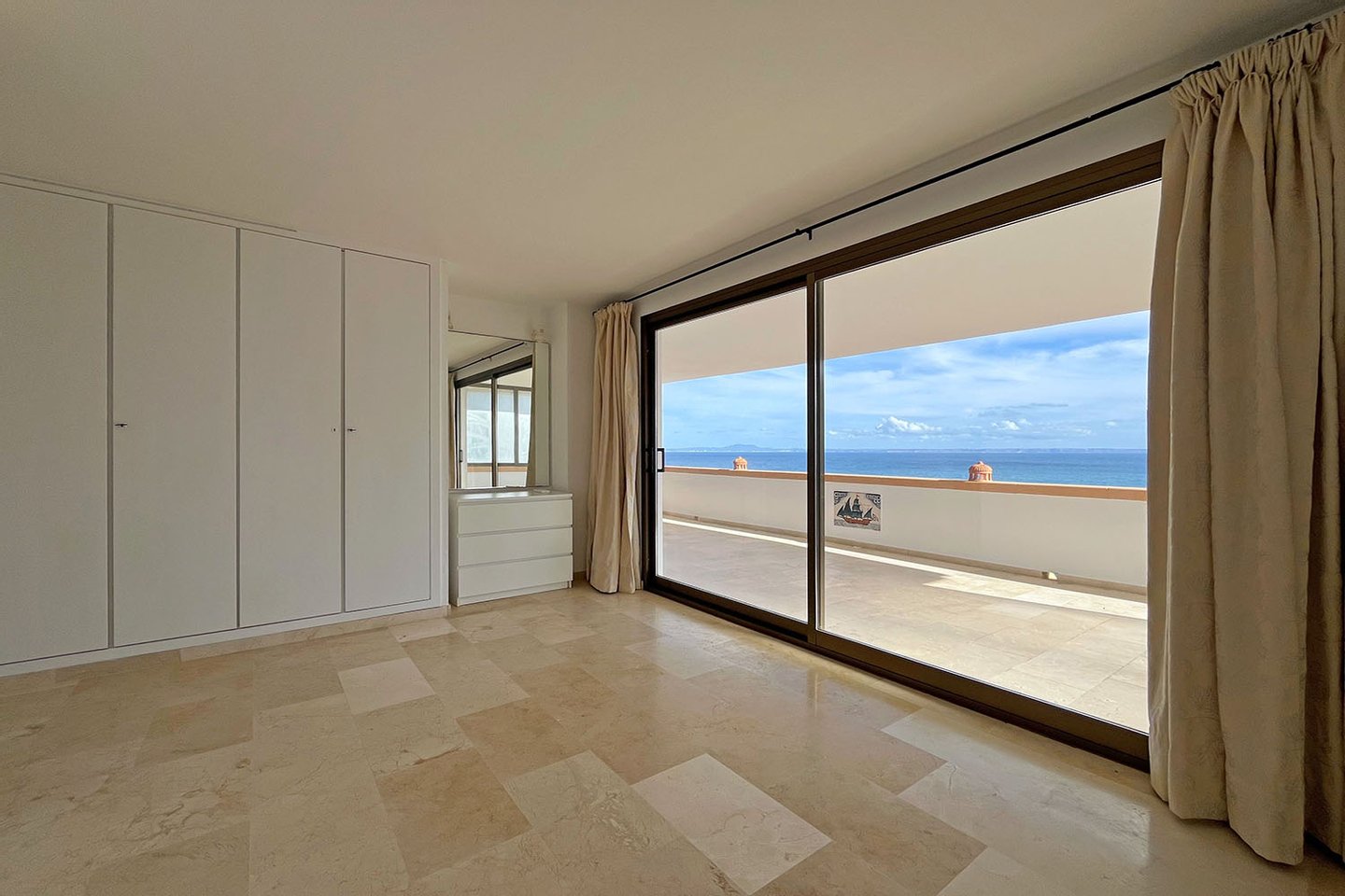 Das dritte Schlafzimmer befindet sich auf der oberen Ebene des Apartments und ist als großzügiger, offen gestalteter Wohn- und Schlafbereich konzipiert. Dieser Bereich eignet sich als 2. Master-Schlafzimmer oder Gästeschlafzimmer und bietet Zugang zu eigener Sonnenterrasse. Von hier aus eröffnet sich ein sensationeller, unverbaubarer Blick auf das Meer.