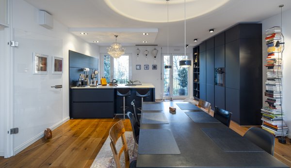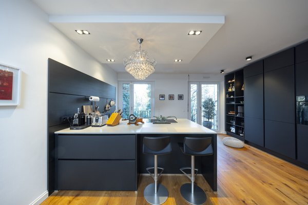 - Einbauküche in Deckenhöhe, Fronten mattschwarz, Fa. Thelen & Drifte, Miele-Geräte (u. a. Induktionskochfeld mit integriertem Abzug)