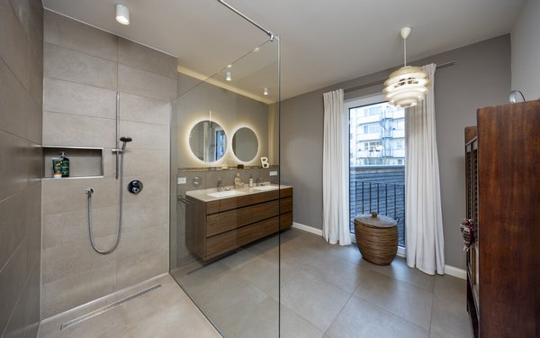- großes Masterbad mit zwei maßgefertigten Waschtischen mit großzügigen Schubladen, großer, ebenerdiger Dusche und separatem WC
