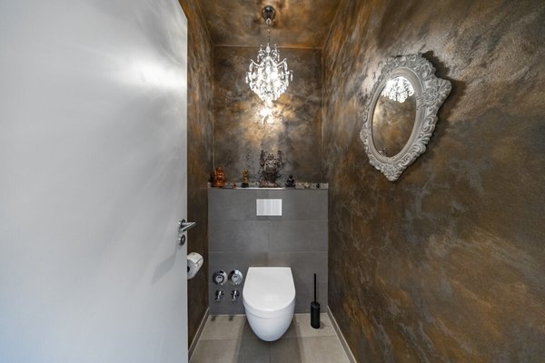 In der Wohnung selbst entfaltet sich ein harmonisches Zusammenspiel aus moderner Architektur, exzellenter Materialwahl und einem professionellen Lichtkonzept, das mit hochwertigen Leuchten stimmungsvolle Akzente setzt. Die rund 2,70 m hohen Räume, großzügigen Aluminiumfenster von Schüco mit elektrischen Raffstores sowie das geölte Vollholz-Parkett in großen Schlossdielen von Parkett Dietrich verleihen den Räumen Eleganz und Großzügigkeit. Wandflächen mit Malervlies sowie gespachtelte, weiß gestrichene Decken sorgen für eine ruhige, klare Atmosphäre.