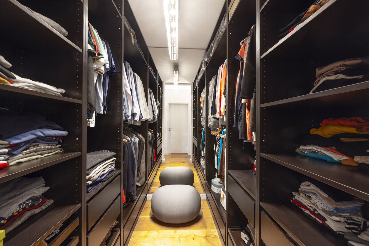 Direkt an den Wohn-Essbereich schließt sich der Mastertrakt an, der als privater Rückzugsbereich konzipiert ist. Im Zentrum dieses Traktes befindet sich eine großzügige, begehbare Ankleide mit maßgefertigter Spiegelwand und eleganter Glastür. An ihr vorbei gelangt man in das exklusive Masterbad, das mit zwei individuell angefertigten Waschtischen, einer geräumigen, ebenerdigen Dusche, einem separaten WC, Marazzi-Fliesen sowie Dornbracht-Armaturen und Villeroy-&-Boch-Keramik höchsten Komfort bietet.