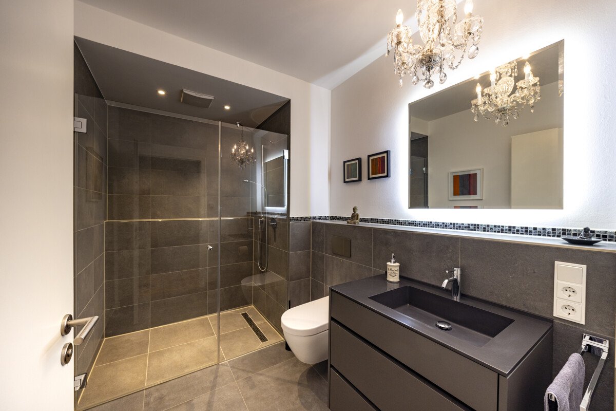 - zweites Bad mit großer ebenerdiger Dusche und wandhängenden, maßgefertigtem Waschtisch mit Schubladen