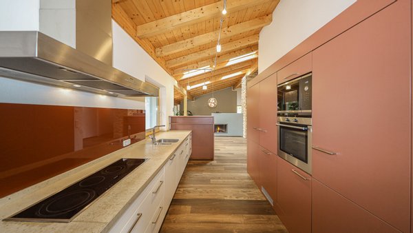 Im Erdgeschoss befindet sich die Diele/Garderobe mit Gäste-WC, der offene Wohn-Essbereich mit Sichtdachstuhl und eine Kombination aus Grundofen und Kaminofen. Angrenzend befindet sich die komplett ausgestattete Küche.