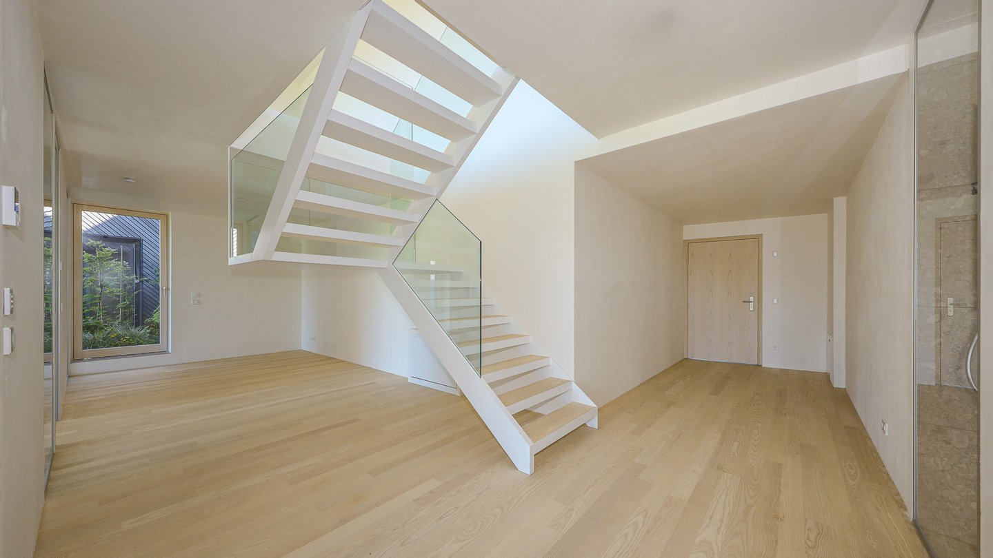 In das großzügige Obergeschoss führt eine Treppe. Ein Lift kann bei Bedarf problemlos in der Zukunft eingebaut werden.