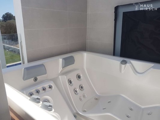 Es stehen zwei große Schlafzimmer mit Einbauschränken zur Verfügung, im Erdgeschoss und das Masterschlafzimmer im Obergeschoss. Ein drittes, etwas kleineres Zimmer im Obergeschoss wird derzeit als Gästezimmer oder Büro genutzt. Der wunderschöne Balkon mit Bergblick lädt zum Entspannen ein, während der zweite Balkon, ideal vom Badezimmer erreichbar, mit einem hochwertigen Hottub der Marke USSPA ausgestattet ist. Große, doppelt verglaste Fenster und die eindrucksvolle Wohnraumempore verleihen dem Haus seine besondere Großzügigkeit und Eleganz.