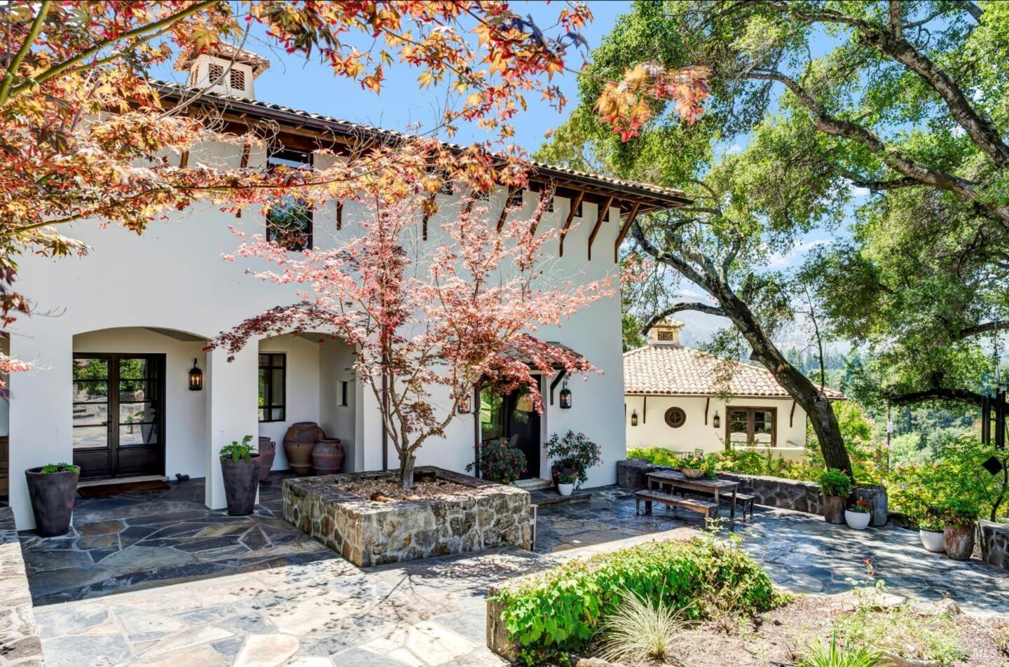 Inspiring Estate where luxury, design and function blend seamlessly with Breathtaking Views. Meticulously maintained 4.4 private acres only three minutes from downtown St.Helena , a two bedroom two bath guest House, 1000sqft finished garage, small