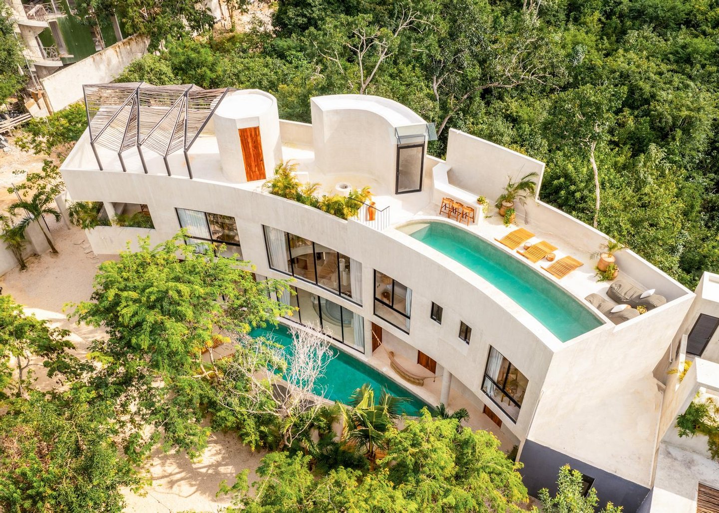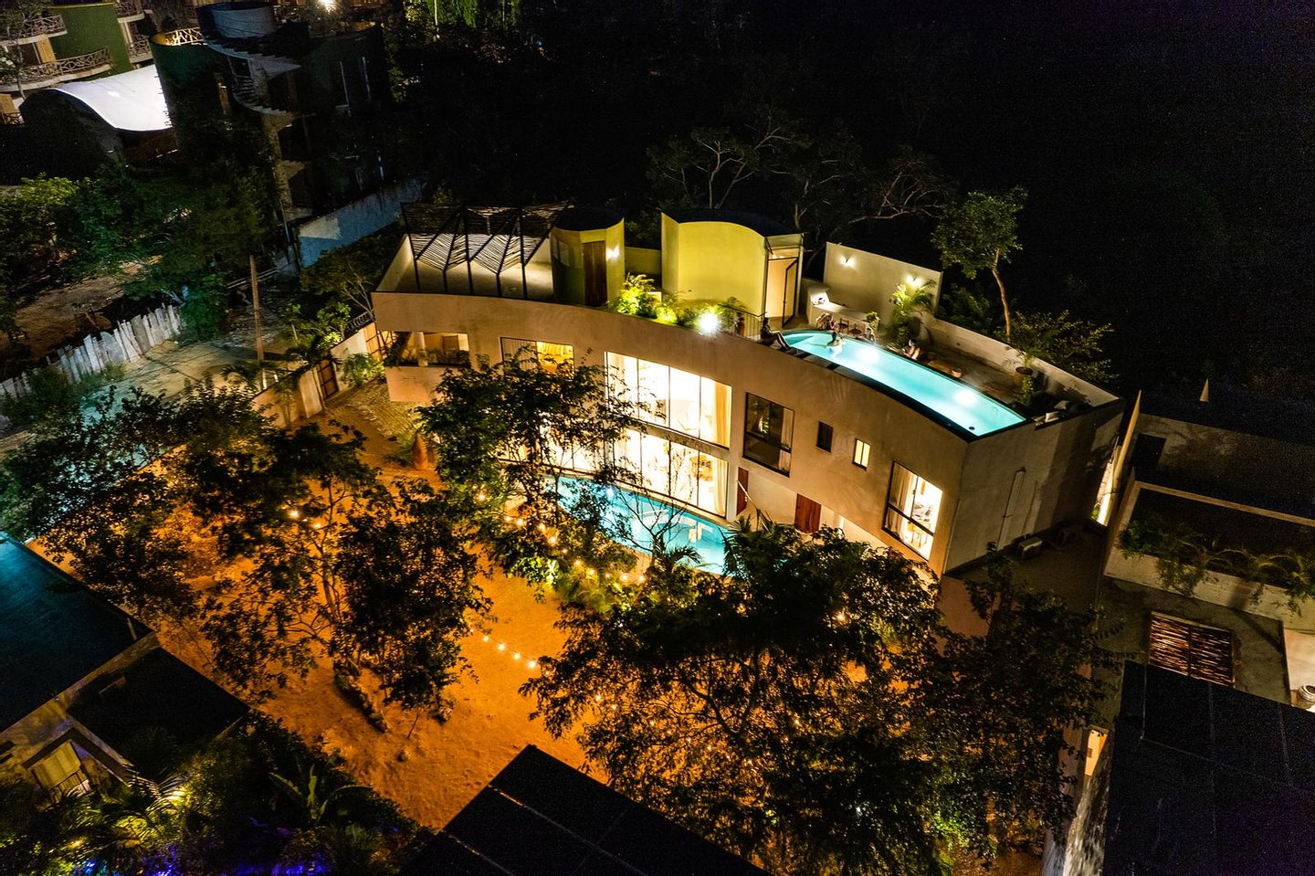 The upper level is the entertainment center par excellence. This stunning rooftop includes an outdoor cinema, a bar, a secondary pool, a solarium, and a shaded wellness area, all designed to enjoy Tulum's stunning sunsets and create unforgettable moments with friends and loved ones.