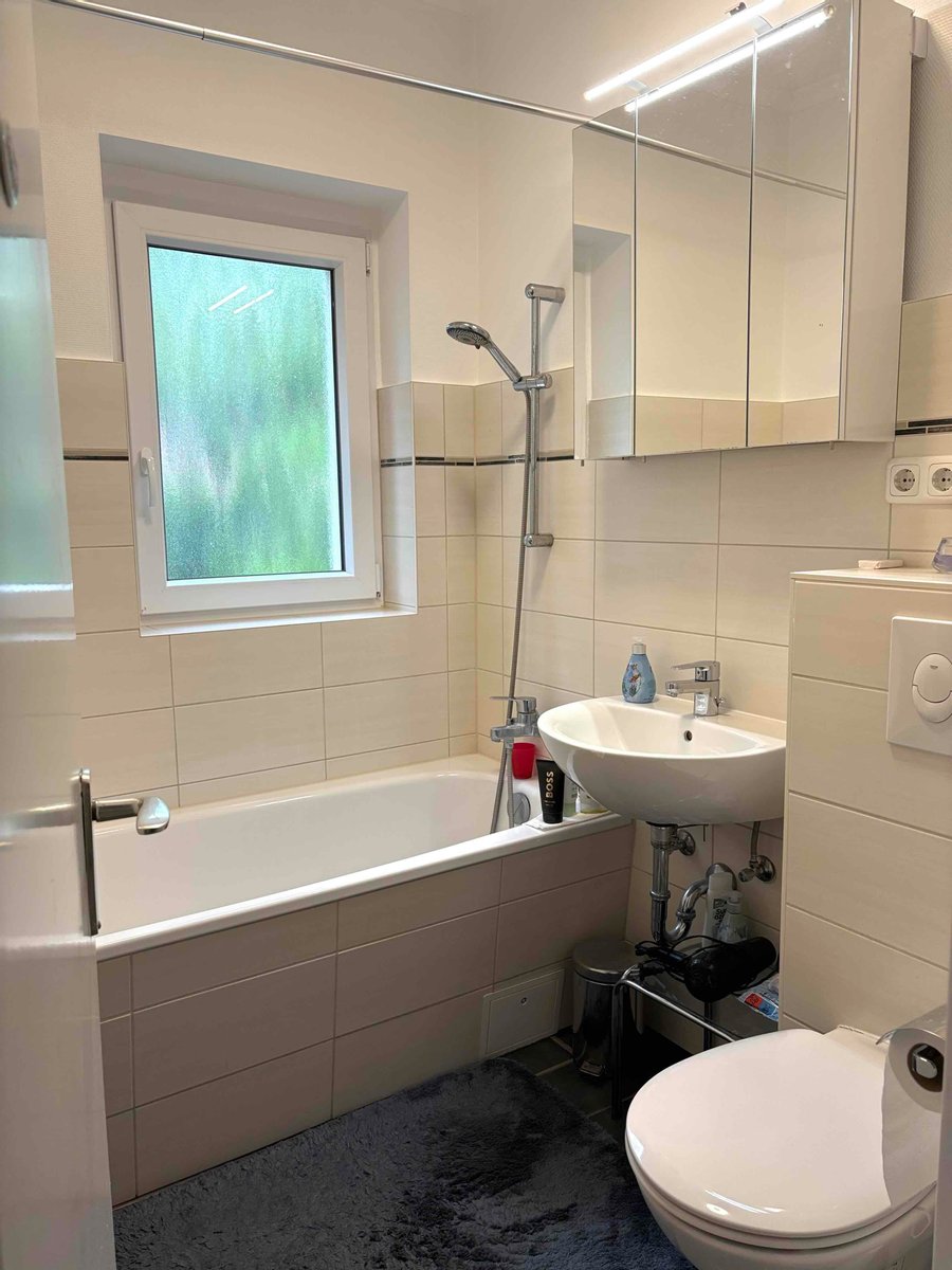 - Saniertes Wannenbad mit Fenster und Handtuchtrockner