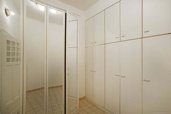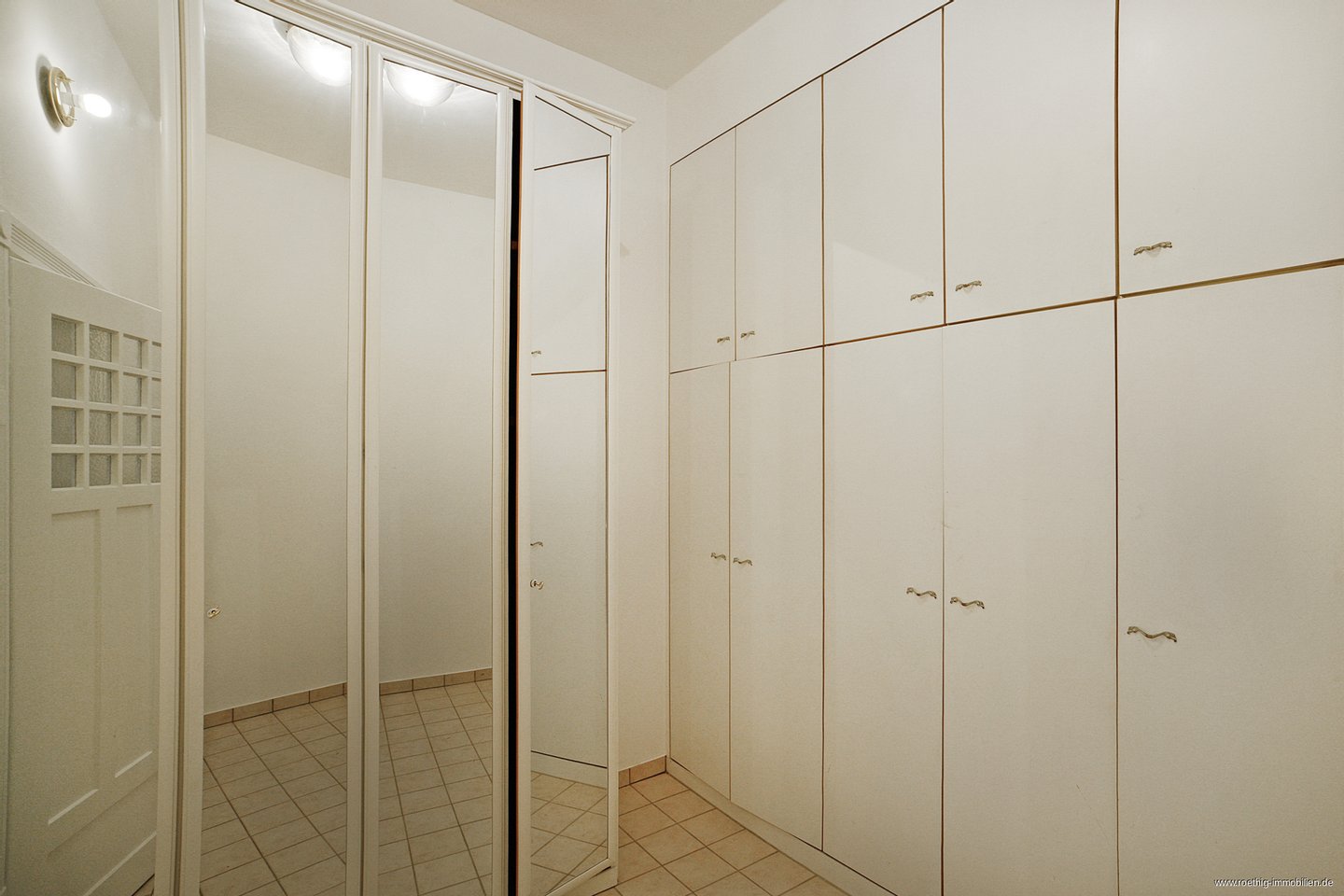 Gegenüber liegt die – für viele eine Wunschvorstellung - begehbare Ankleide. Der Boden ist mit pflegeleichten Fliesen versehen und ein großer Einbauschrank bietet genügend Stauraum für Ihre Garderobe.