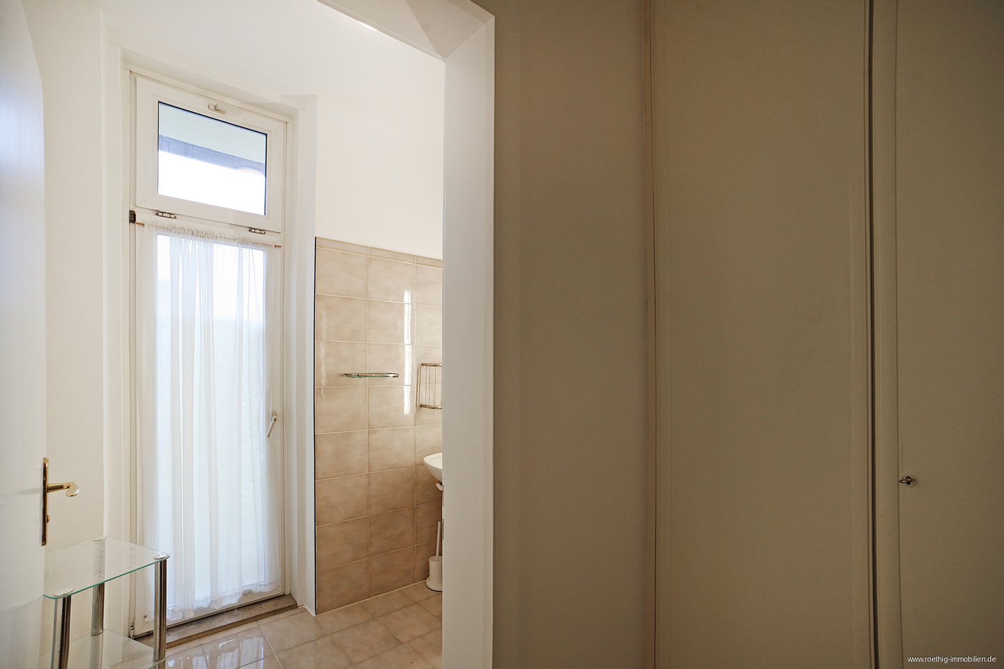 Das Gäste-WC liegt rechts vom Flur und bietet Zugang zu einem der Balkone. Dieser ist in Richtung Innenhof ausgerichtet und somit ruhig gelegen.