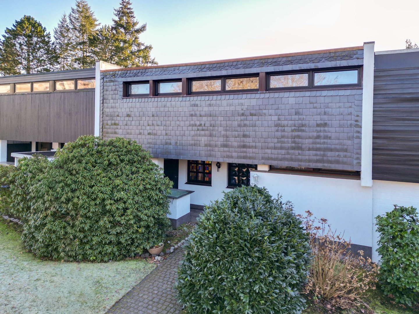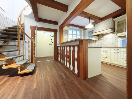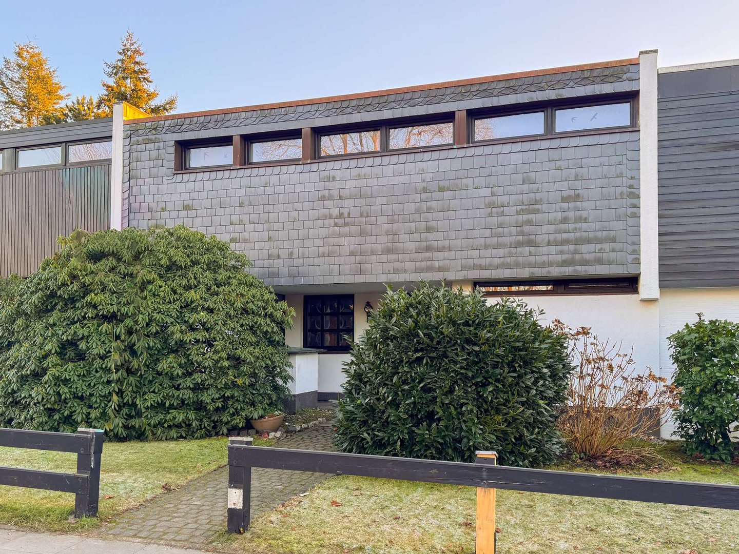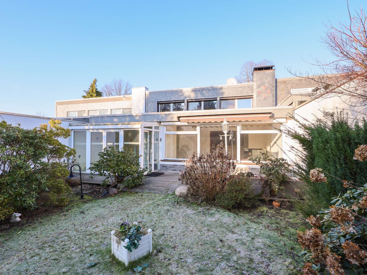Das charmante Reihenhaus wurde 1965 als Terrassenhaus errichtet. Das ca. 340 m² große Südgrundstück ist real geteilt, zusätzlich wird eine Garage mit einer anteiligen Fläche von ca. 38 m² mit veräußert. Das familienfreundliche 4-Zimmer-Reihenhaus bietet ca. 132 m² Wohnfläche. Im Erdgeschoss erwartet Sie ein großzügiger Wohn-/ Essbereich mit Kamin, Wintergarten und direktem Zugang zur Terrasse. Das Arbeitszimmer ist über einen Durchbruch mit dem Wohnbereich verbunden, dadurch gestaltet sich der Raum besonders großzügig. Die hochwertige, geräumige Küche ist offen zum Flur gestaltet und verfügt über eine praktische Durchreiche zum Essbereich. Ein Gäste-WC komplettiert das Erdgeschoss.