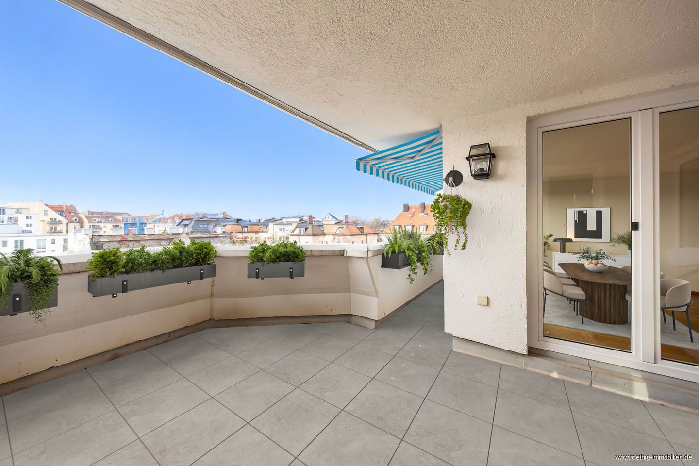Im 5. Obergeschoss, zwischen Josephsplatz und Theresienstraße sowie nur wenige Schritte von der Schellingstraße entfernt, erwartet Sie diese einzigartige, weitläufige Dachgeschosswohnung mit Dachterrasse und Lift samt traumhaftem, freiem Blick über