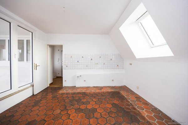 Ein weiteres Highlight stellt die geräumige, helle Wohnküche mit Dachterrassenzugang dar. Ein großes, nach Süden ausgerichtetes Dachflächenfenster und der breite, bodentiefe Zugang zur Dachterrasse fluten den Raum mit Licht und verbinden Küche und Außenbereich harmonisch miteinander. Hier bietet sich Ihnen die perfekte Möglichkeit, Ihre Traumküche nach Ihren individuellen Vorstellungen zu verwirklichen.