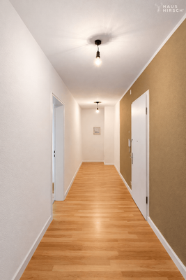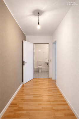 Der außergewöhnlich lange Flur verbindet alle Räume und bietet hervorragende Voraussetzungen für maßgeschneiderte Stauraumlösungen oder die Abtrennung eines praktischen Abstellraums. Das Badezimmer präsentiert sich klassisch und funktional und ist mit einer komfortablen Badewanne ausgestattet.